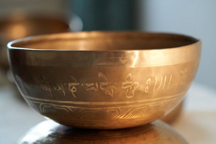 Bei der Klangmassage werden auf den bekleideten Körper verschieden Klangschalen aufgelegt und sanft angeschlagen.